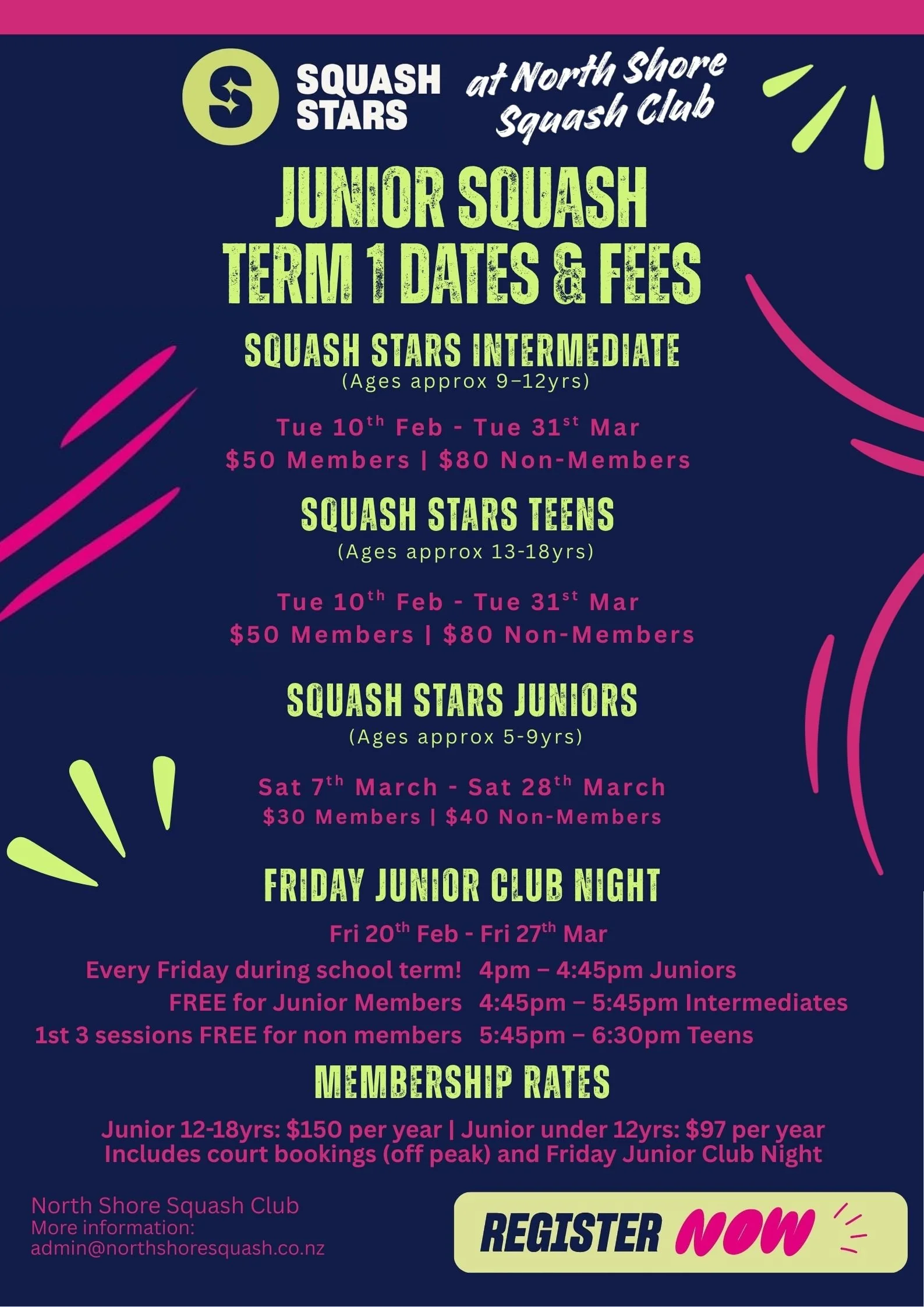 For those juniors who are enjoying their time on the court and are wanting to improve their skills and move up the grading, NSSC offers the perfect junior academy pathway. Run by one of NZ’s best squash coaches, it's split into 3 groups: Development squad 1 (J Grade) & 2 (E-D grade) and the performance squad (C grade & above). Training 1-2 times per week in small groups 4-8 juniors, this